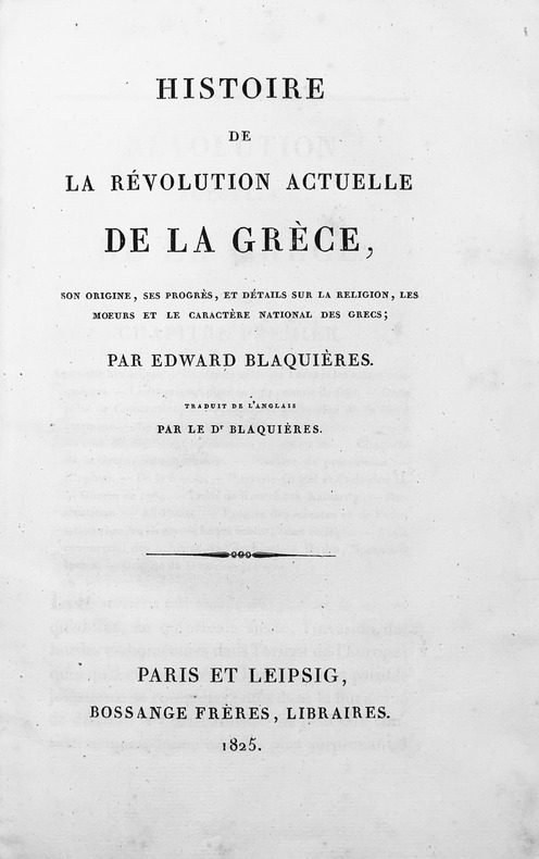 Première édition française, traduite de l'anglais par l'auteur lui même. Edward Blaquières était un officier de marine britanique, descendant d'une famille protestante française installée en Grande-Bretagne après la révocation de l'édit de Nantes. Il fut un des membres fondateurs du Comité philhellénique de Londres, et en fut, avec Bowring, le principal animateur, contribuant grandement à la lutte pour la libération des Grecs. Bon exemplaire. Quelques piqûres. Atabey, 116. — Blackmer, 151. — Droulia, 779.
