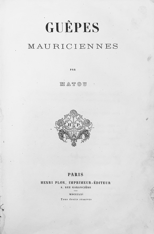 Première et seule édition ancienne. Recueil de 53 chroniques sur la vie mondaine et culturelle de l'île Maurice écrites entre juillet 1858 et mai 1861, date du départ de son auteur. Bon exemplaire portant une étiquette mentionnant : Livre provenant de la bibliothèque du trois-mâts Alphonse commandé par mon grand-père Henry Maugat, de Paimboeuf. On trouve également un envoi autographe : Souvenir d'amitié. Marius Arnault, Tamatave 14 aout 1862. Légères piqûres, coins usagés, premier plat dédoré. Ryckebusch, 5576. — Toussaint et Adolphe, D-1069.
